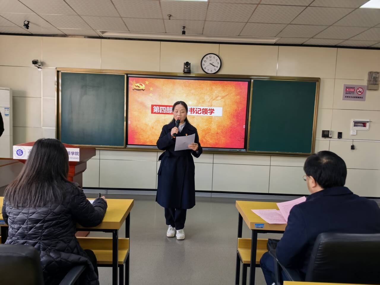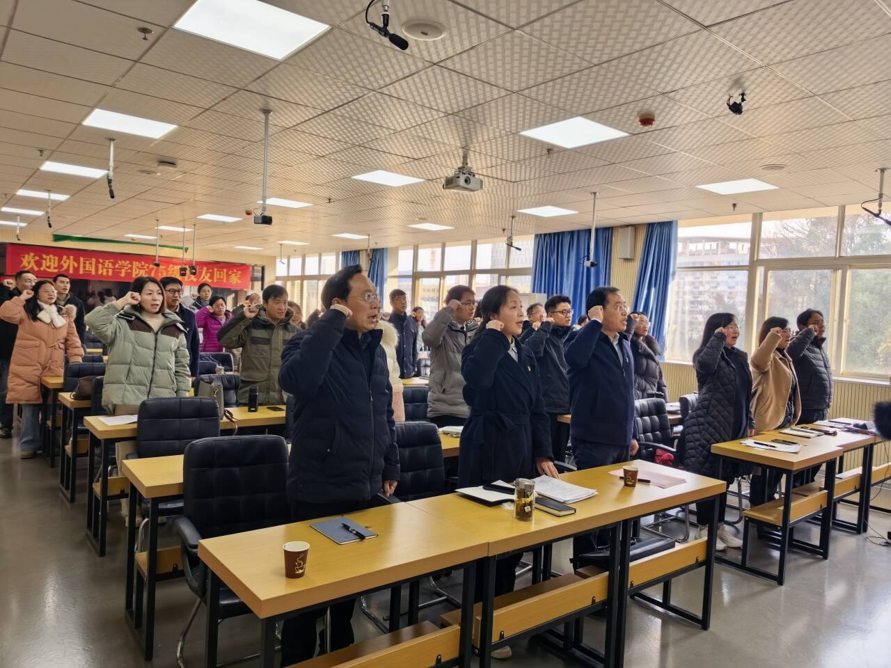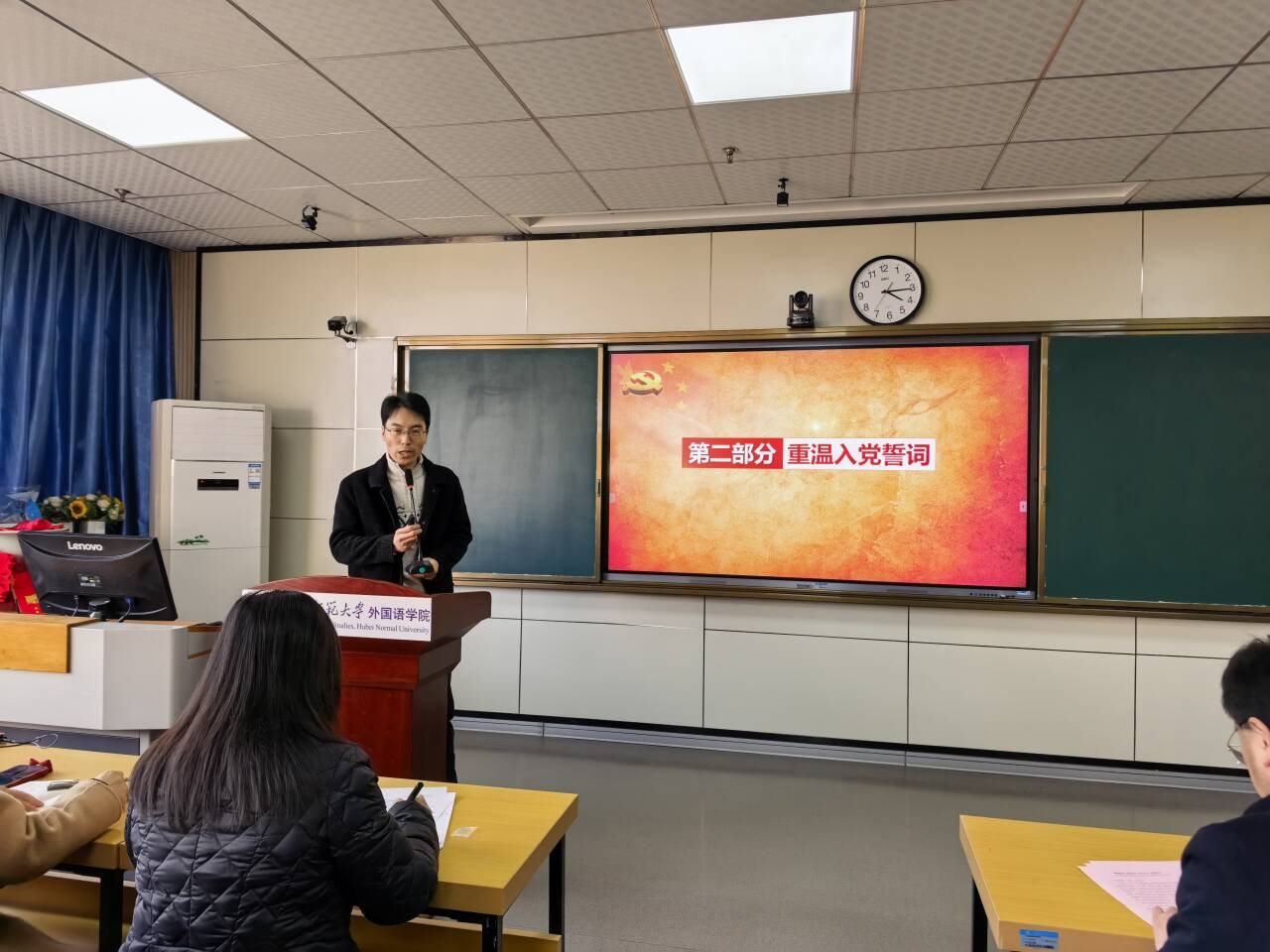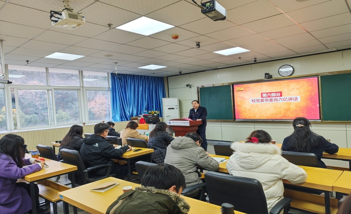 为深入学习贯彻习近平新时代中国特色社会主义思想,巩固拓展学习教育成果,将理论学习成果转化为推动学院高质量发展的强大动力,凝心聚力冲刺全年目标任务,12月25日下午,外国语学院教工党支部在人文楼21B602开展主题党日活动。本次活动以“深入学习四中全会精神 奋力冲刺全年目标任务”为主题,校党委常委、统战部部长肖六亿以普通党员身份全程参与,外院党委书记王海燕、院长刘敏、党委副书记朱露露、副院长项军平、朱勇进与全体教职工党员以及学生党员代表齐聚一堂,共学共研、共话奋进。活动由教工第一党支部书记董志浩主持。