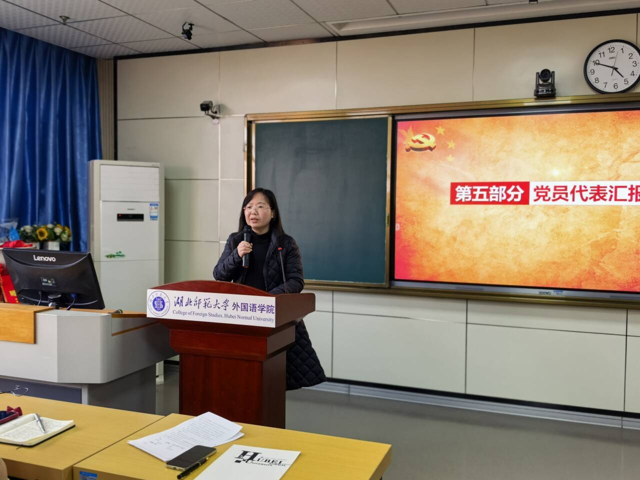 外国语学院院长刘敏以“奋力冲刺全年目标任务”为主题分享体会。她立足学院发展全局,全面汇报了全年重点工作推进成效:教学育人成果丰硕,3个本科专业在省级监测评估中获评A等,英语、商务英语专业跻身全国前列,学生在各级学科竞赛中斩获194 项奖项;学科改革持续深化,自主设置的“国别与区域研究”二级学科获批,科研工作量超额完成,国际学术研讨会获新华社等媒体广泛关注;特色品牌影响力持续扩大,省级课程思政教学研究示范中心辐射全国200余所院校。她强调,学院的发展离不开全体师生的团结协作,希望全体党员牢记初心使命,讲团结、守正气,以全会精神为指引,聚焦“党建引领、教学提质、科研突破、人才引育、社会服务” 五大目标,凝心聚力、真抓实干,确保圆满完成全年各项任务。