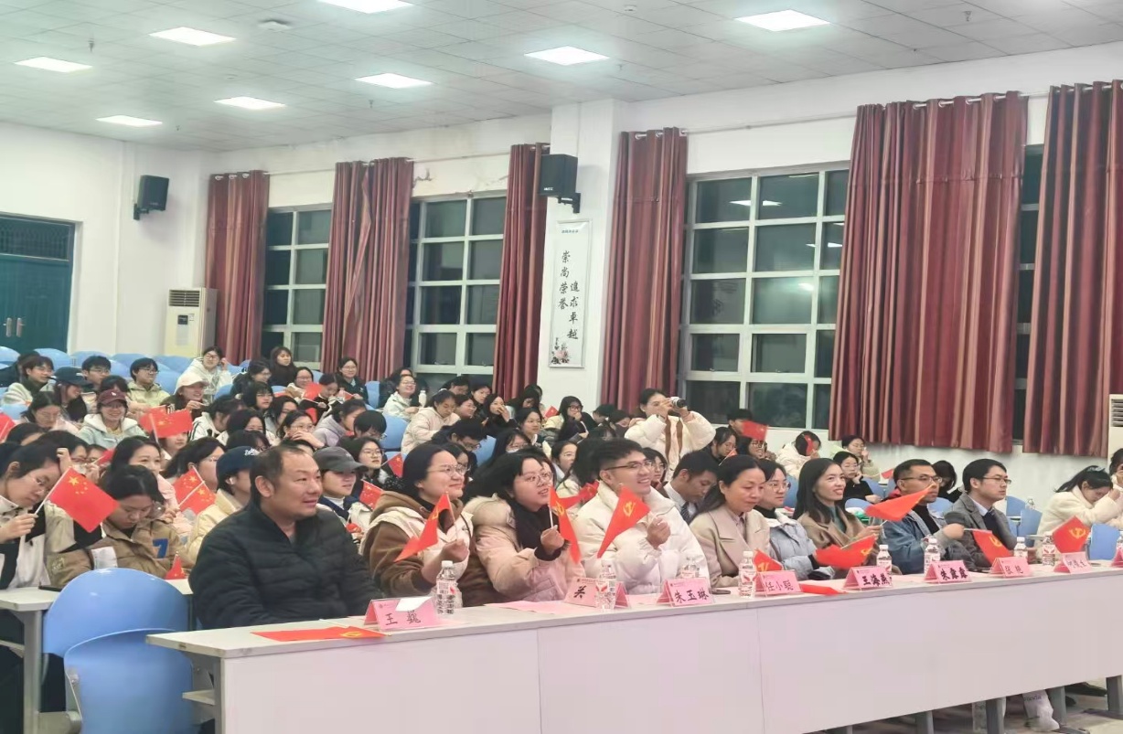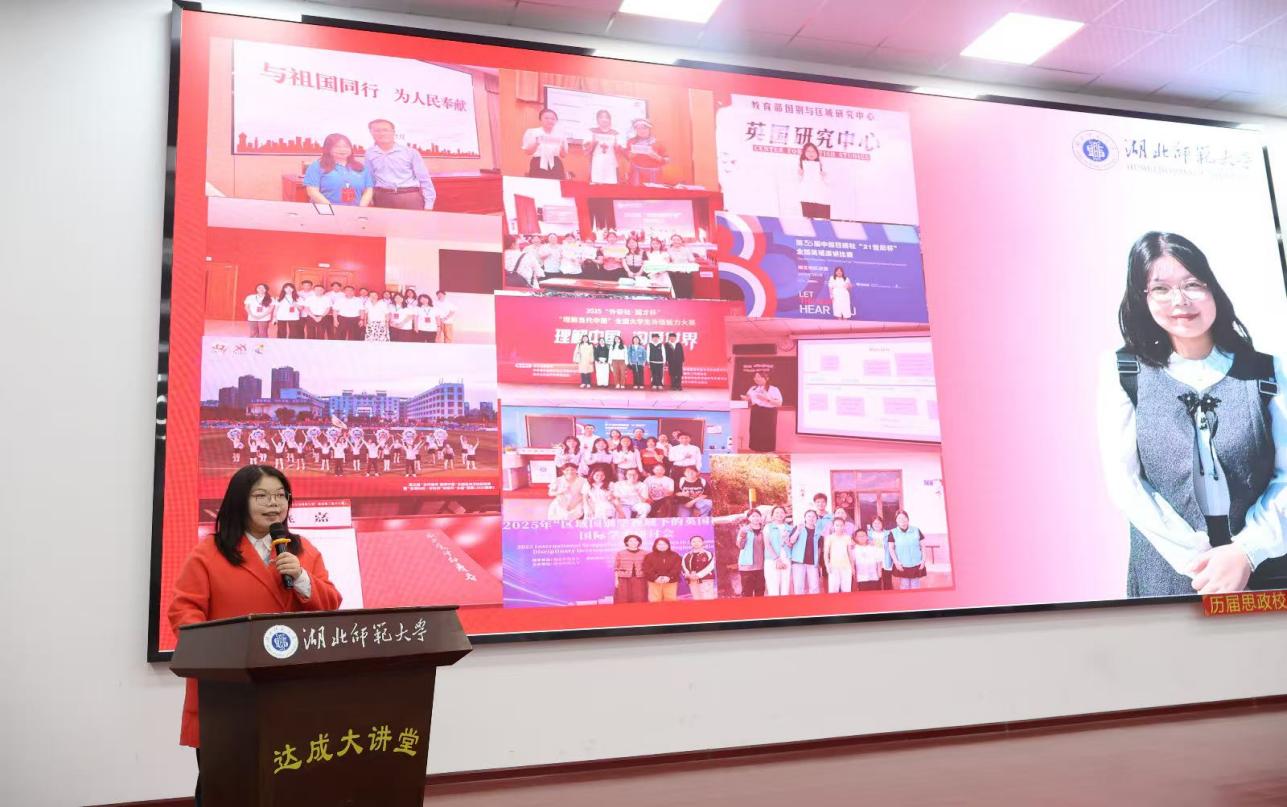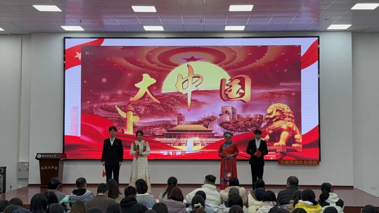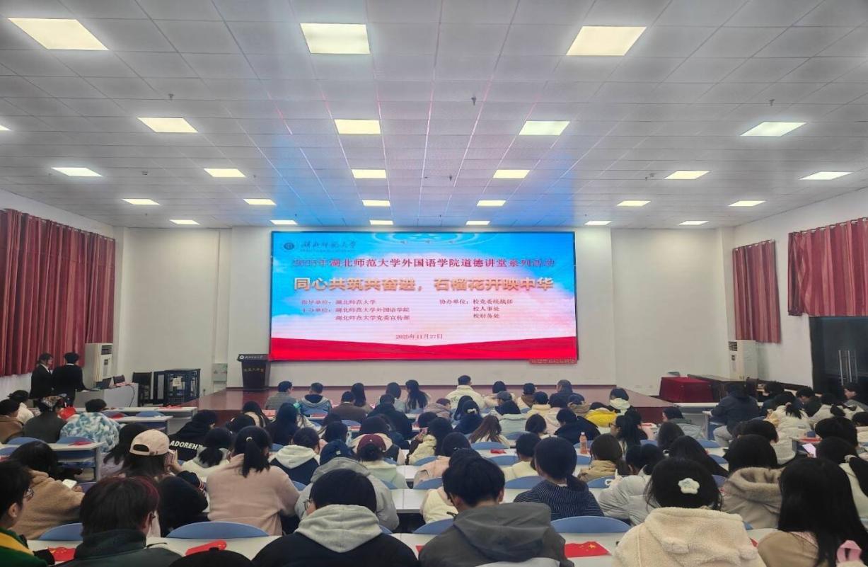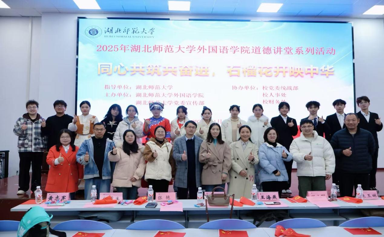 11月27日晚,外国语学院于人文楼达成大讲堂隆重举办“同心共筑共奋进,石榴花开映中华”主题道德讲堂活动。本次活动由校宣传部与学院联合主办,作为“勤敏”辅导员工作室系列育人活动的重要组成部分,以引导青年学子树立正确民族观、铸牢中华民族共同体意识为核心主旨,特邀湖北师范大学党委统战部张艳老师、人事处任小聪老师、财务处王巍老师莅临指导,外国语学院党委书记王海燕、党委副书记朱露露及各年级辅导员出席本次活动,2025级全体学生共同参与,携手见证这场兼具思想深度与文化温度的精神盛宴。活动由冯祯芳、胡忠瑞主持。