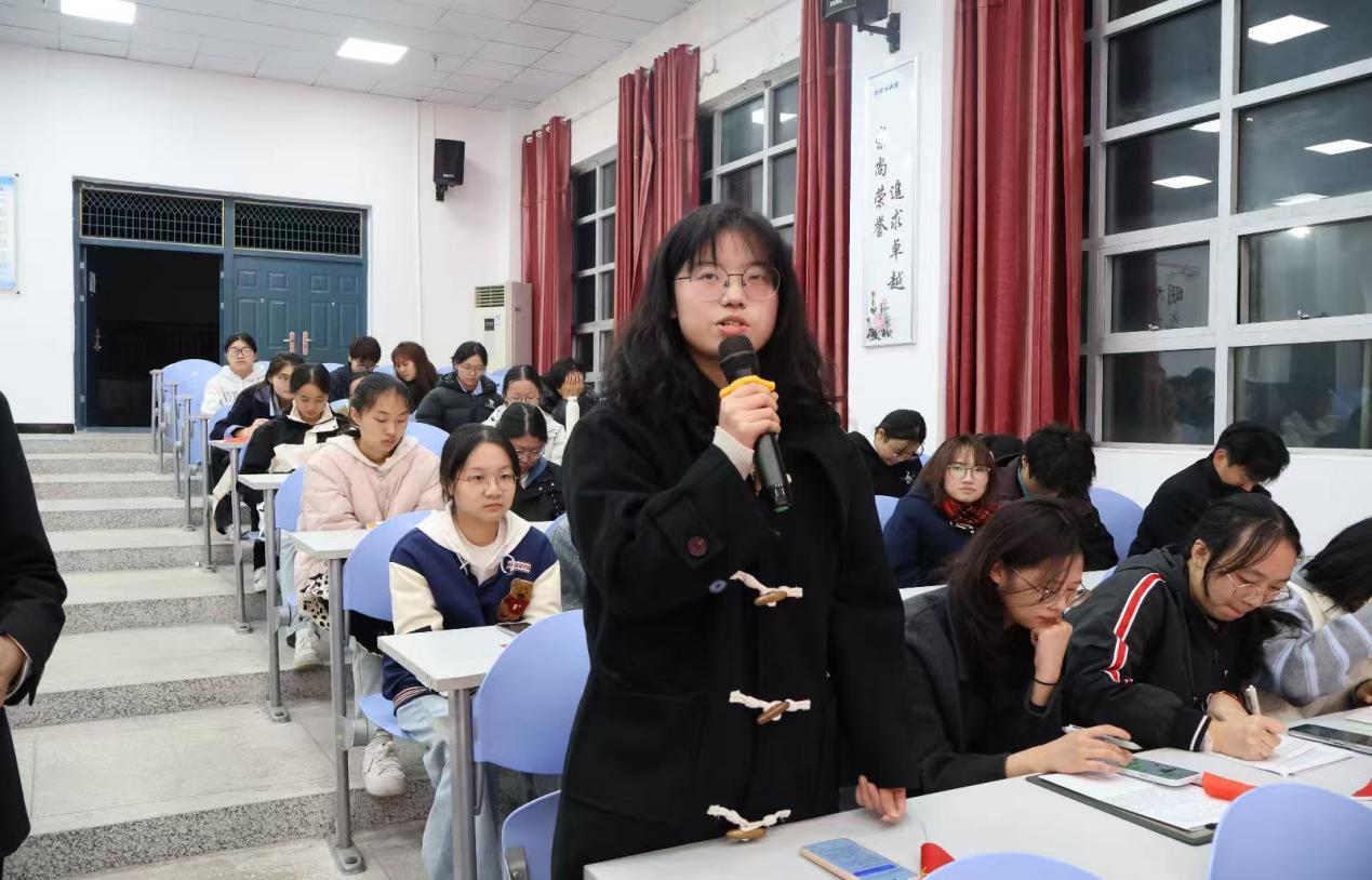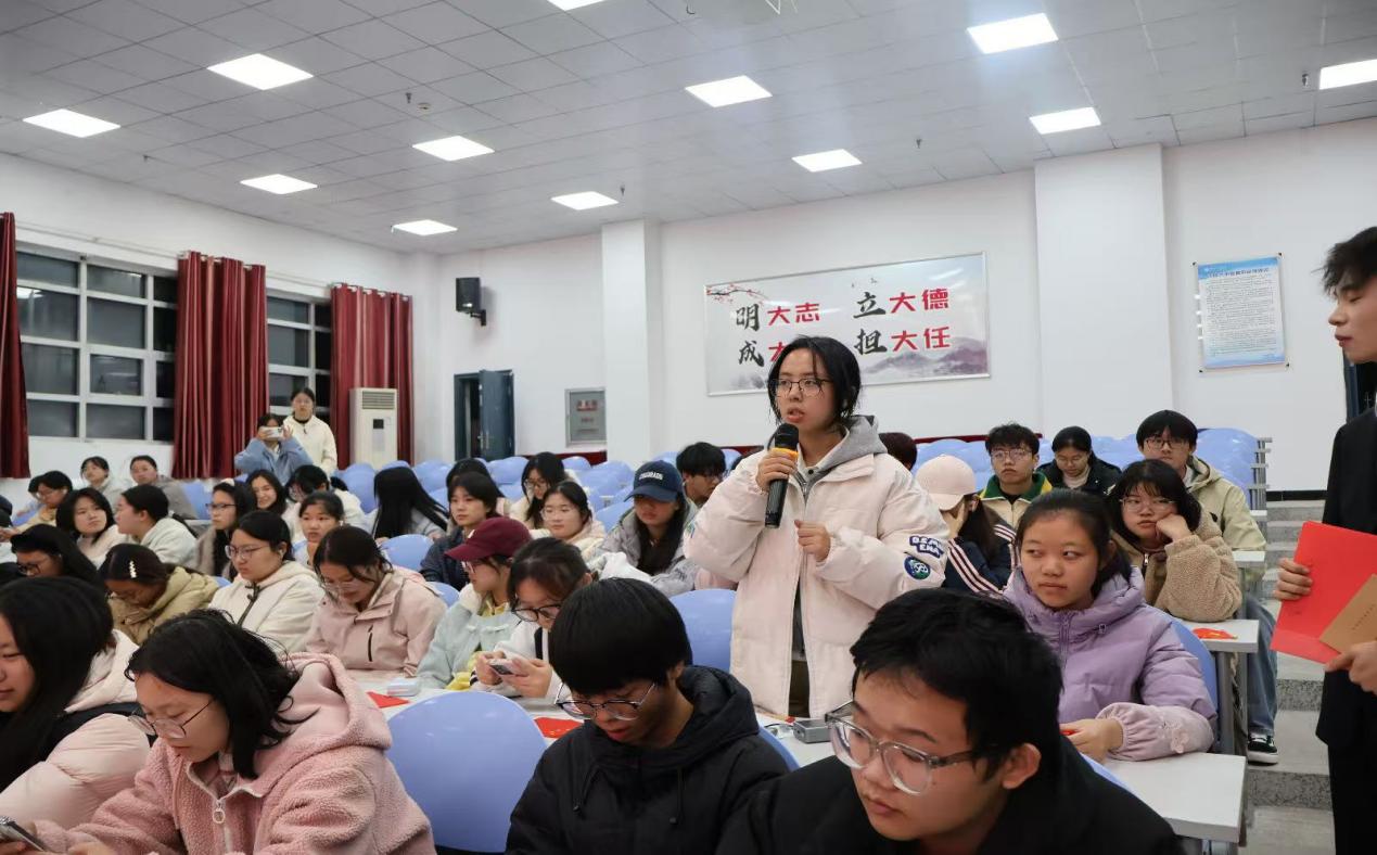 思想的碰撞催生共鸣,心灵的交流凝聚力量。在互动交流环节,主持人以 “你知晓哪些民族特色饮食与服饰?作为外语专业学生,能为民族文化国际传播做些什么?”引发热议,2025级同学们踊跃发言,分享真切感受。有的细数维吾尔族烤馕、苗族银饰、藏族藏袍等文化瑰宝,有的谈及对民族团结内涵的全新理解,有的结合专业畅谈跨境翻译、外宣推广等传播路径,更有同学讲述身边民族团结小故事,表达投身民族地区服务的决心。真挚的分享、务实的思考,让铸牢中华民族共同体意识的理念在交流中入心。