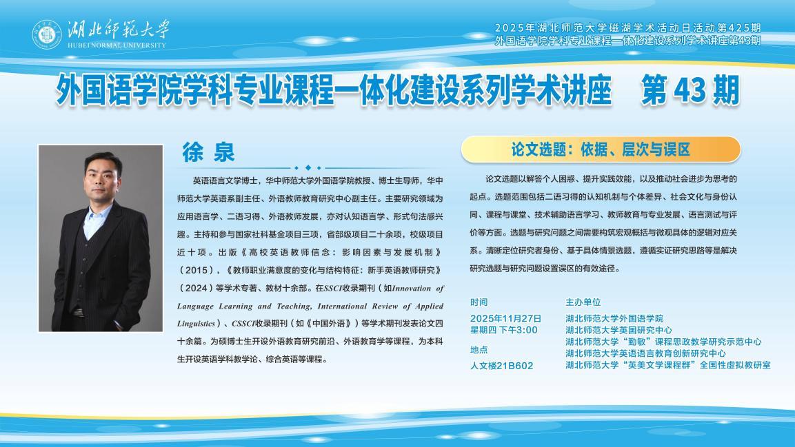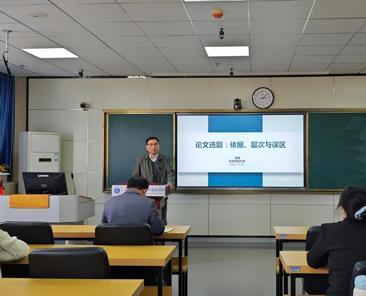 为深化学科专业课程一体化建设,全面提升研究生学术素养与教学实践能力,11月27日下午,外国语学院在人文楼602会议室成功举办系列学术活动。活动特邀华中师范大学徐泉教授担任主讲嘉宾,依次开展了专题讲座、硕士学位论文指导及研究生教学展示现场点评,内容充实,环节紧凑。