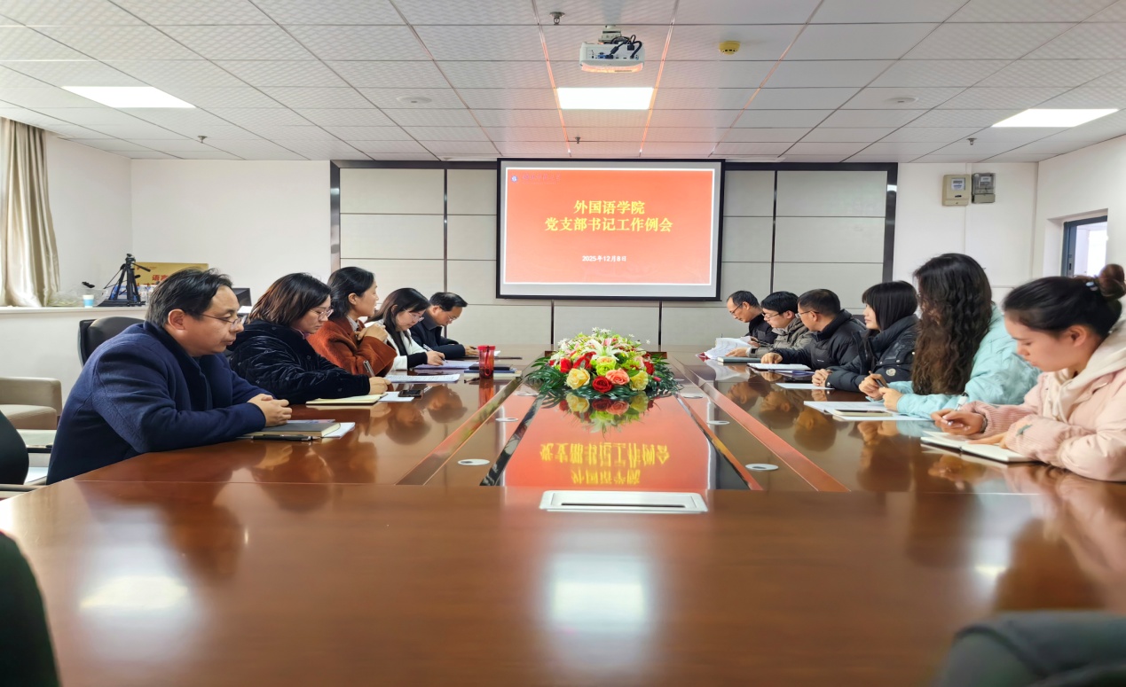 12月8日下午,外国语学院党委召开2025年度第四季度党支部书记例会。外院党委书记王海燕主持会议并讲话,外院党委委员、各党支部书记参加会议。