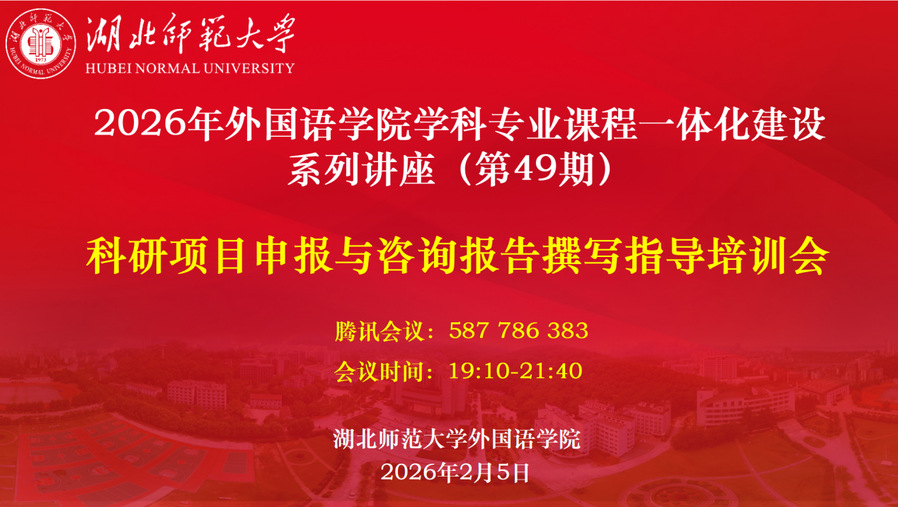 2026年2月5日,湖北师范大学外国语学院成功举办题为“科研项目申报与咨询报告撰写指导培训会”第49期“学科专业课程一体化建设”系列学术讲座。本次讲座邀请了科学发展研究院副院长冯伟林教授、马克思主义学院胡雅琼博士和外国语学院朱勇进副院长三位老师主讲。讲座由外国语学院院长刘敏主持,学院专任教师参加了本次培训。